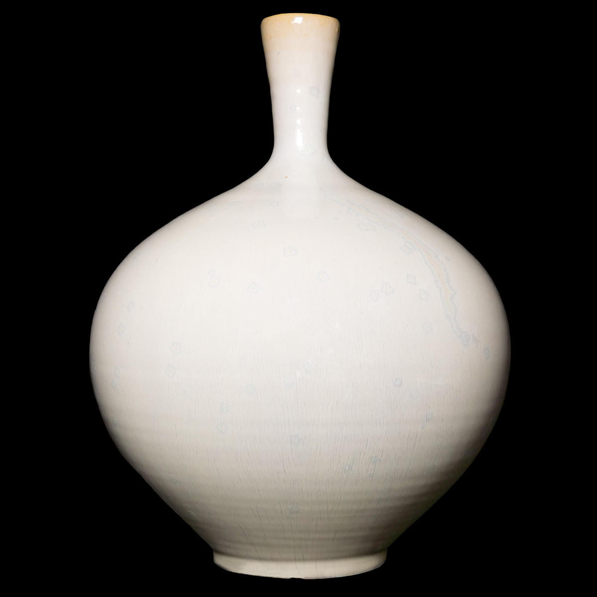 Supernova is a highly fluid creamy white translucent glaze with a crystalline surface like frost on a window. The gloss glaze surface is opalescent and breaks slightly more cream than white.