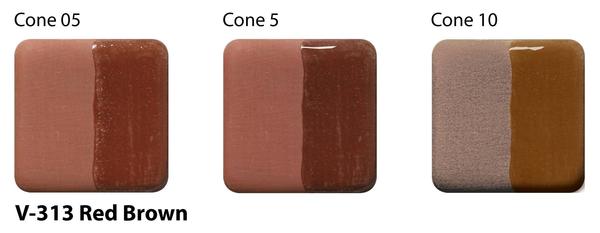 Red Brown is a warm cocoa color with a red tint at cone 05/06. The color darkens at cone 5/6 and becomes chocolate brown at cone 10. A clear glaze deepens the color significantly at any temperature.