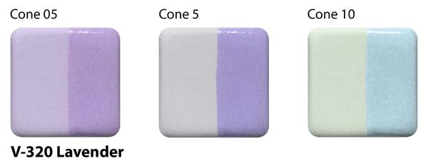 Lavender is a periwinkle color that is soft at cone 05/06, becomes deeper at cone 5/6 and burns out at cone 10. A clear glaze will accentuate the color at cone 05/06 and 5/6 and preserve some of the blue tone from the underglaze at cone 10.