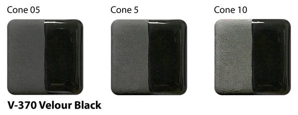 Velour Black is a warm black that is deep and velvety at cone 05/06. AT cone 5/6 it darkens and becomes warmer and at cone 10 it becomes even darker. A clear glaze will accentuate the color significantly at any temperature.