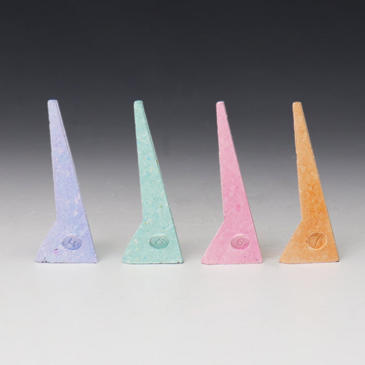 These cone packs have 8 Self Supporting Cones in them, no need for cone holders or little balls of clay.  Each cone has the number stamped on its base.  Place your cones so they will not touch anything as they bend.  Your target cone (the temperature you want to reach) should be bent 90 degrees after firing.  If your cone falls shy or exceeds 90 degrees, please contact us and we will help you figure out why.