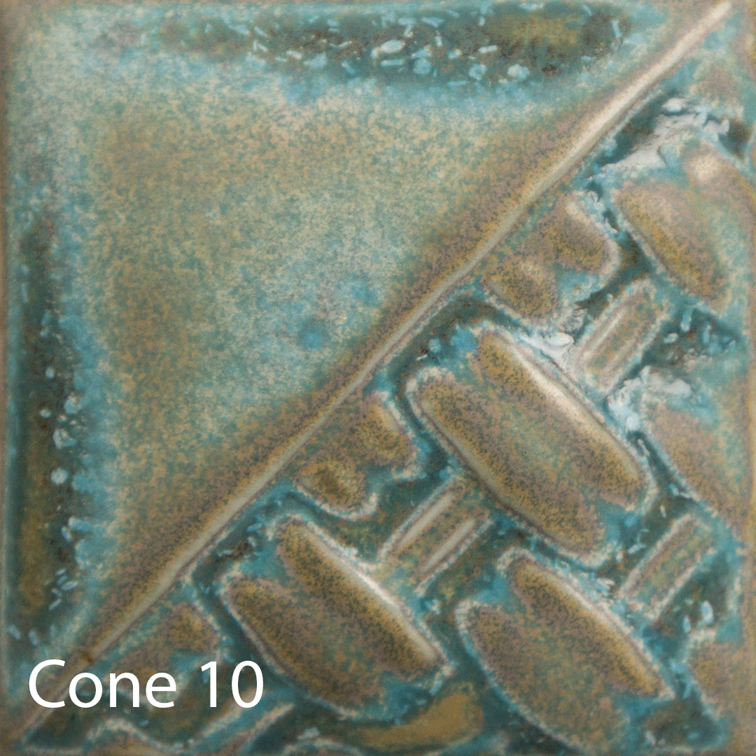 Cone 10 (second image): Glaze shifts grey with white/turquoise pixelization. Glaze remains stable.