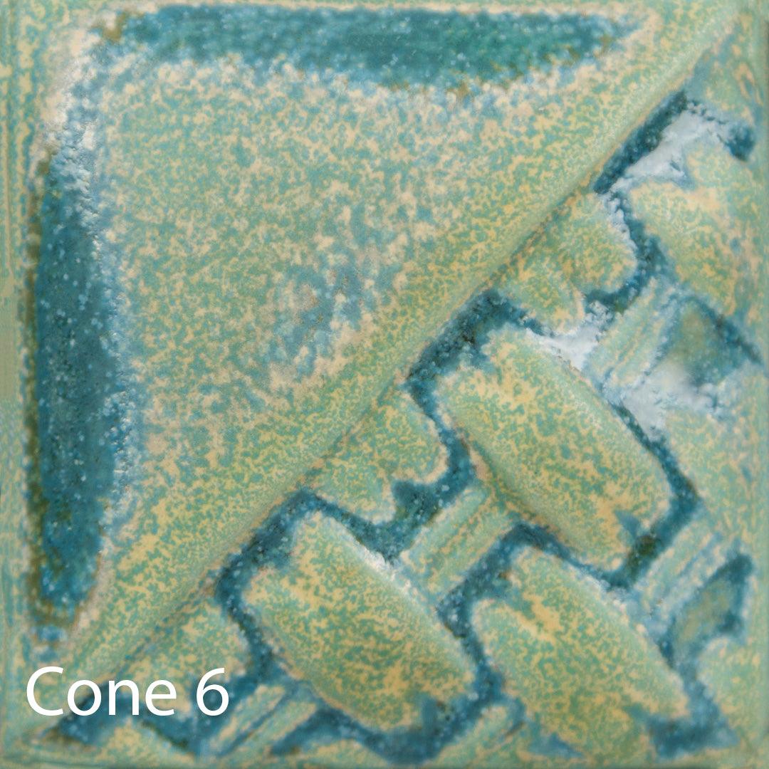 Cone 6 (first image): Riptide is a satin-matte, opaque, pixelated turquoise/green glaze that breaks over texture and develops a glossy finish where thick or pooling.