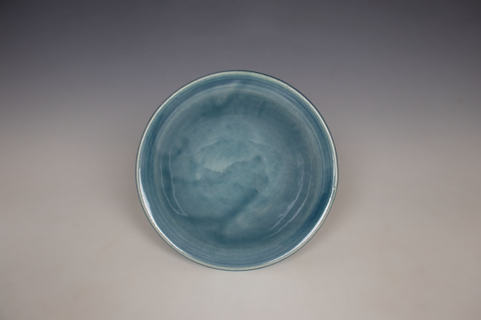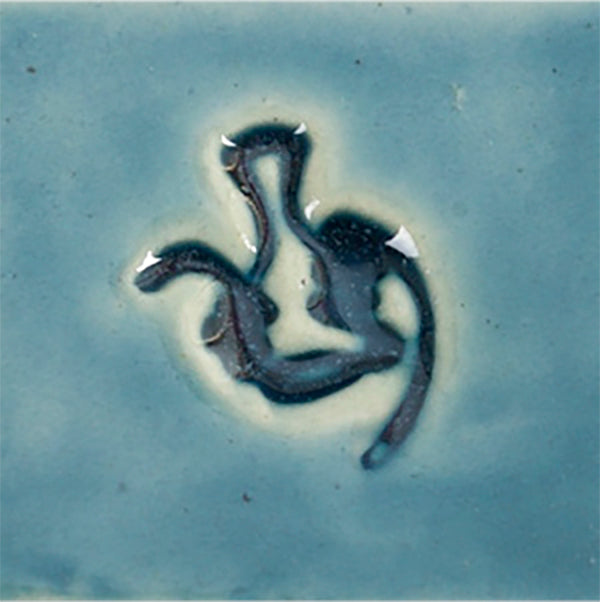 Shadow Blue is a semi-transparent, glossy blue glaze. On porcelain it will be a lighter blue, on white clay it will be a slightly darker blue, on red clay it will be a dark blue-green.