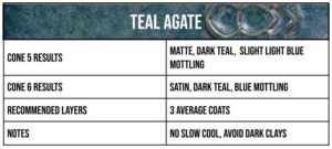 Teal Agate is a rich teal color with a satin to matte finish that provides a surface reminiscent of precious stones. With three even coats or one dip, Teal Agate will continue to tell an intriguing story through dynamic mottling. Teal Agate is a welcomed accent, but is not recommended for use on dark clay bodies.