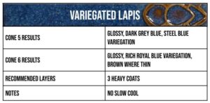 Variegated Lapis is a gloss glaze with a bold amalgamation of dark to light shades of blue with brighter shades of seaweed green wherever it breaks. When fired at Cone 5, this glaze has deep dark steel blue tones. Variegated Lapis will assuredly make bold statements wherever it is applied.