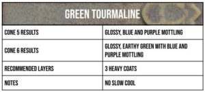 Green Tourmaline is a gloss glaze that manifests a balance of yellows, blues, purples and greens creating a harmonious surface packed with depth. Benefiting from a thicker application, Green Tourmaline will continuously play a complex tune around any surface. When fired to Cone 5 this glaze brings out dynamic purple and blue tones. A good stir before application will help maximize color variations throughout the finish.