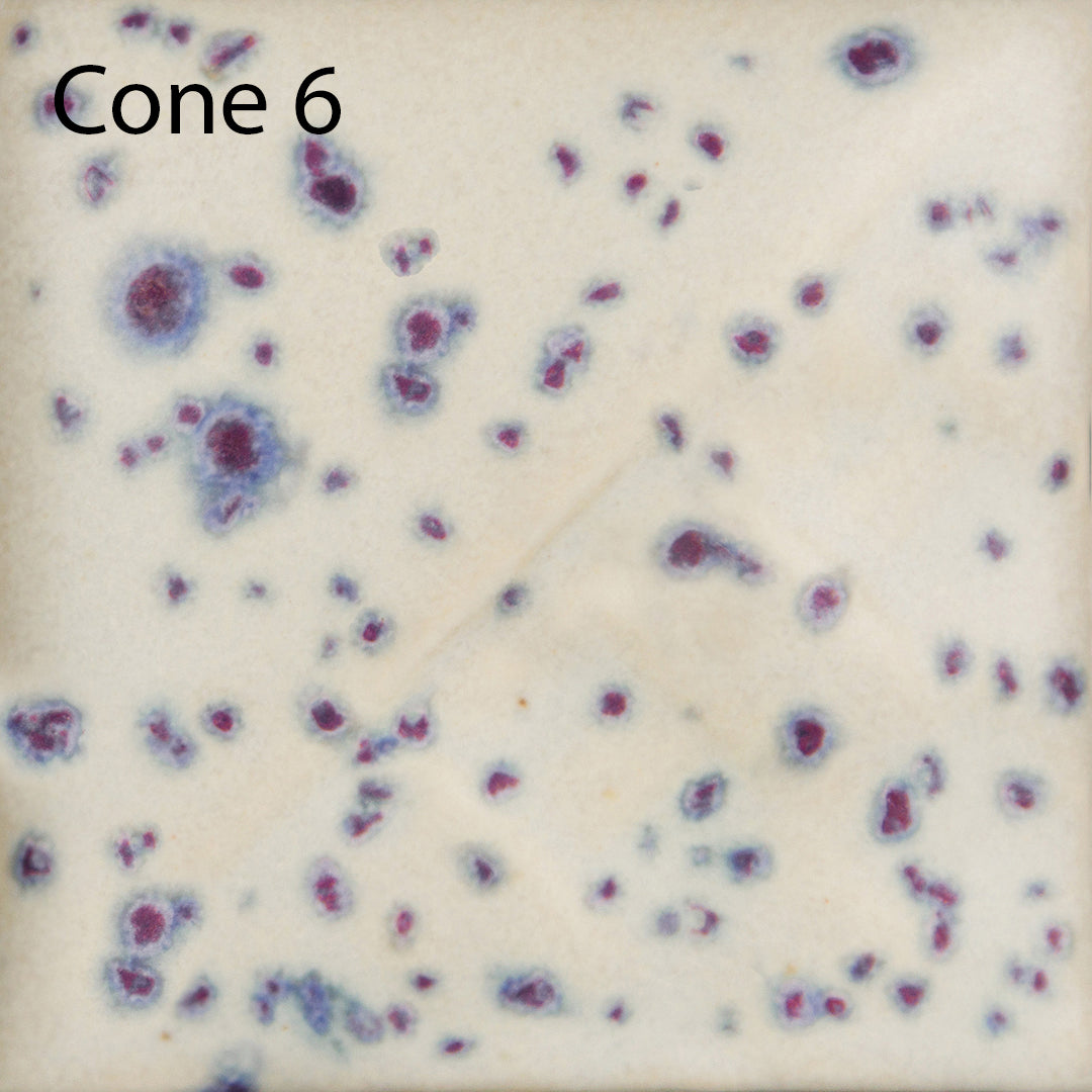 Cone 6: Indigo Rain is a matte white glaze that contains a two-toned purple and violet crystal. As the crystal melts, a purple crystal with violet specks appears. The glaze has a soft subtle beauty.