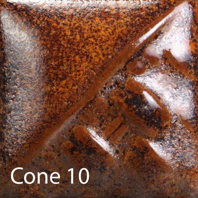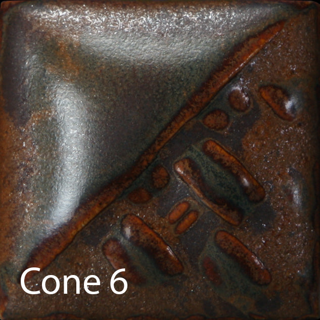 Cone 6: Rusted Iron is a semi-matte, opaque glaze that displays shades of metallic orange and brown. The variation of the glaze is dependent on application.