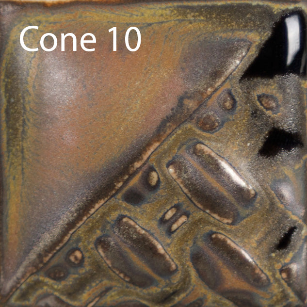 Cone 10: Color variation increases, producing darker red/brown hues where thin/breaking and brighter orange and gold where thick/pooling.