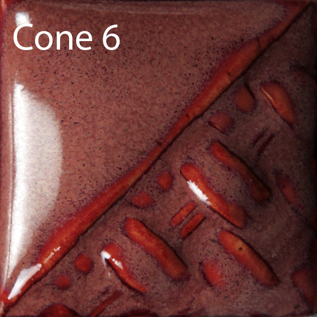 Cone 6: Speckled Plum produces a reddish brown gloss finish (one to two light coats) and evolves to deliver floating maroon-mauve tones with heavier applications (three to four coats). Heavier applications may also yield bands of reddish-mauve specks when used with certain clay bodies. While you’ll enjoy how Speckled Plum moves, the glaze will not run off your ware during a cone 6 oxidation firing.