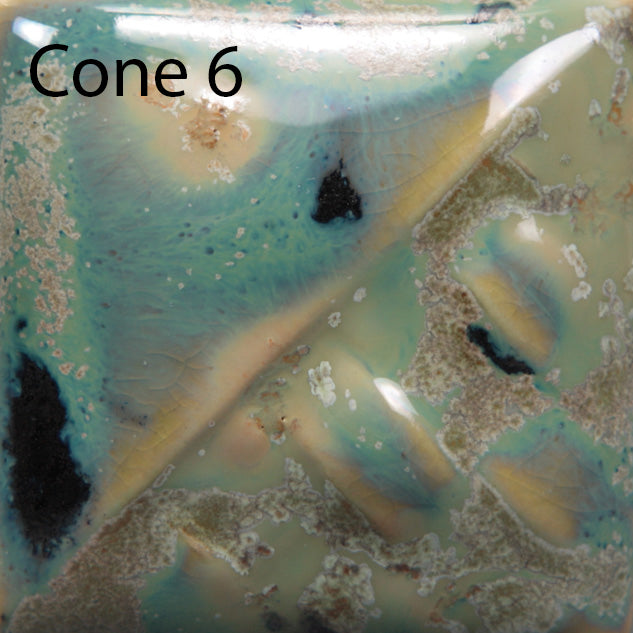 Cone 6: Aurora Green produces a mottled aqua gloss glaze with light brown and large black crystals. As the crystals melt, bursts of blue and brown will develop.