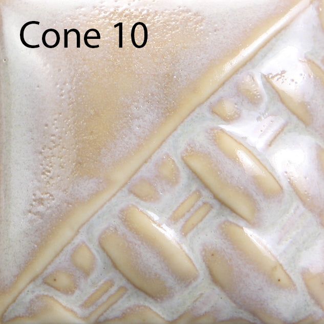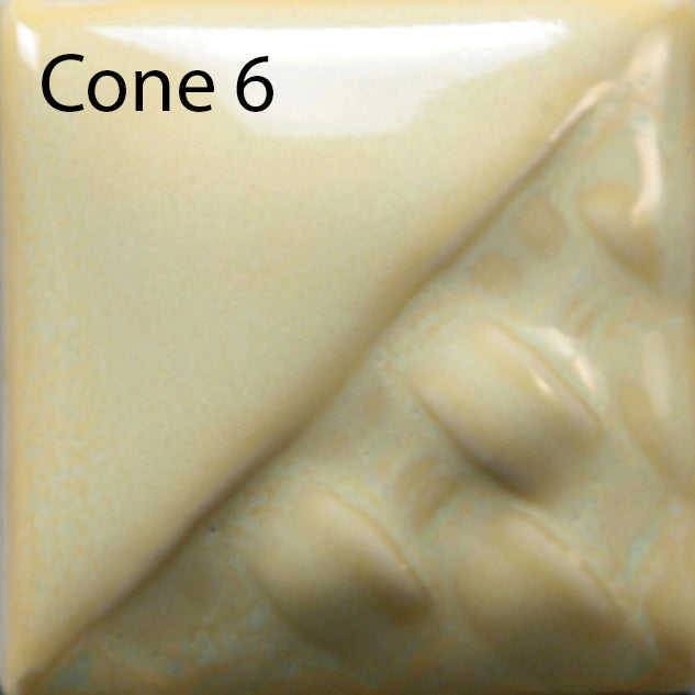 Cone 6: Frosted Lemon is a semi-opaque gloss yellow glaze that displays shades of yellow and white. The variation of glaze depends on application. The thicker the application, the more homogenous the color will be. The glaze will break translucent where thinner and pool darker around surface textures.