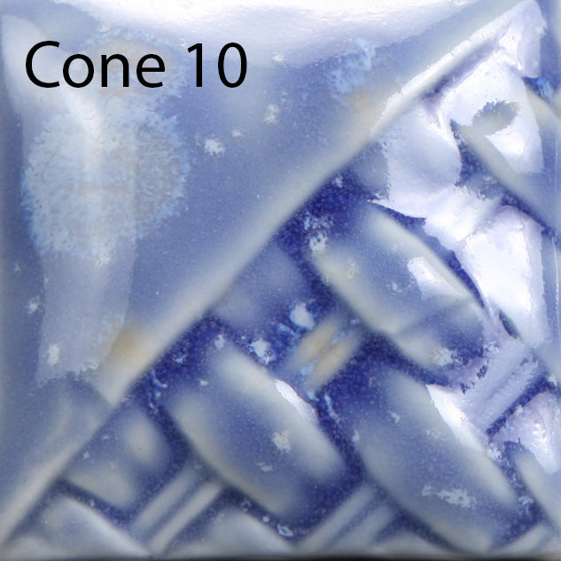 Cone 10: Color changes to blue. Crystals fade slightly.