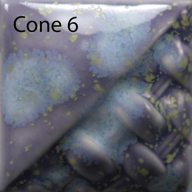 Cone 6: Blue Hydrangea is a blue floral inspired glaze that contains yellow and white crystals. As the crystals melt, large white blooms and smaller yellow blooms appear in the glaze.