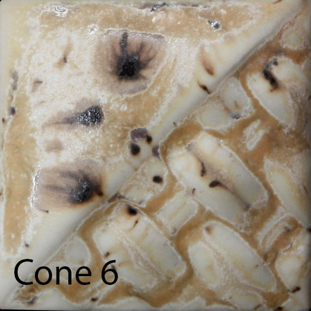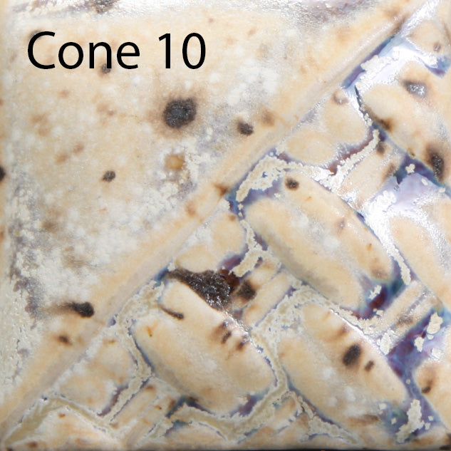 Cone 6: Sandstone is a matte, off-white glaze that contains a variety of brown crystals that melt during the firing. Thicker application and heavy crystal concentration will produce more glossy blue/purple variation.