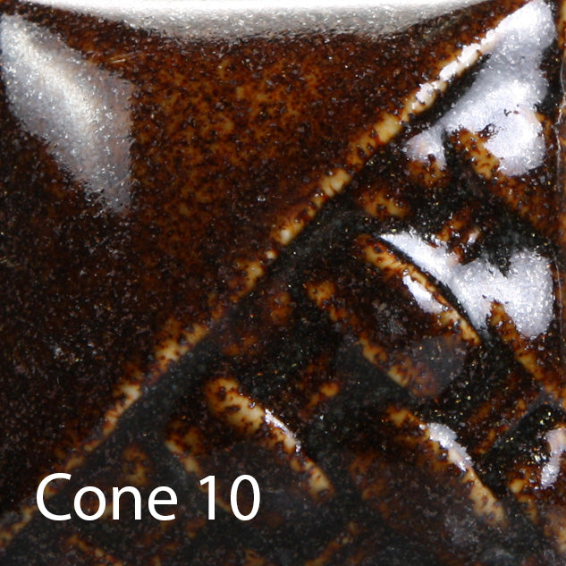 Cone 6: Fool’s Gold is a gloss, semi-transparent glaze consisting of a rich brown base with tiny, gold metallic flecks. The variation of glaze depends on application. The thicker the application, the more homogenous the color will be. The glaze will break translucent and pool darker around surface textures.