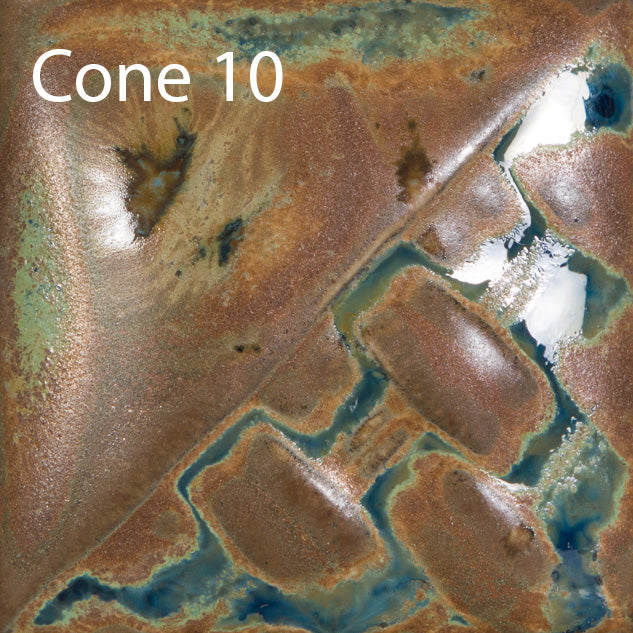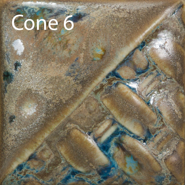 Cone 6: Muddy Waters is a matte brown glaze with crystals that melt into a glossy blue. Heavier crystal application will produce more color variation.