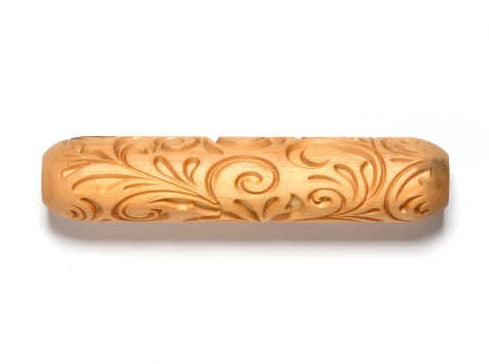 This Hand Roller is 12 cm (4.75 inches) long and 2.5 cm (1.0 inch) in diameter. You simply roll them with your hand across the clay or up the wall of a pot to create a beautiful pattern in the clay.