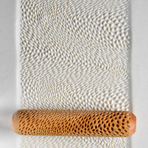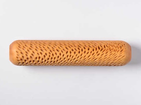 This Hand Roller is 12 cm (4.75 inches) long and 2.5 cm (1.0 inch) in diameter. You simply roll them with your hand across the clay or up the wall of a pot to create a beautiful pattern in the clay.
