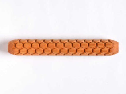 This Hand Roller is 10 cm (4 inches) long and 1.5 cm (5/8ths inch) in diameter. You simply roll them with your hand across the clay or up the wall of a pot to create a beautiful pattern in the clay.