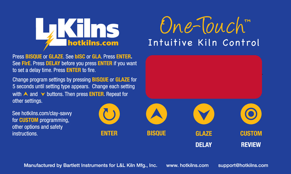 Proprietary One-Touch™ Intuitive Kiln Control is designed for busy school teachers - One touch and you are ready to fire the bisque and glaze programs typically used in schools (also easy to adjust simple parameters like cone, delay, hold, heat-up and cool-down rates). You can even create four custom ramp/hold programs.