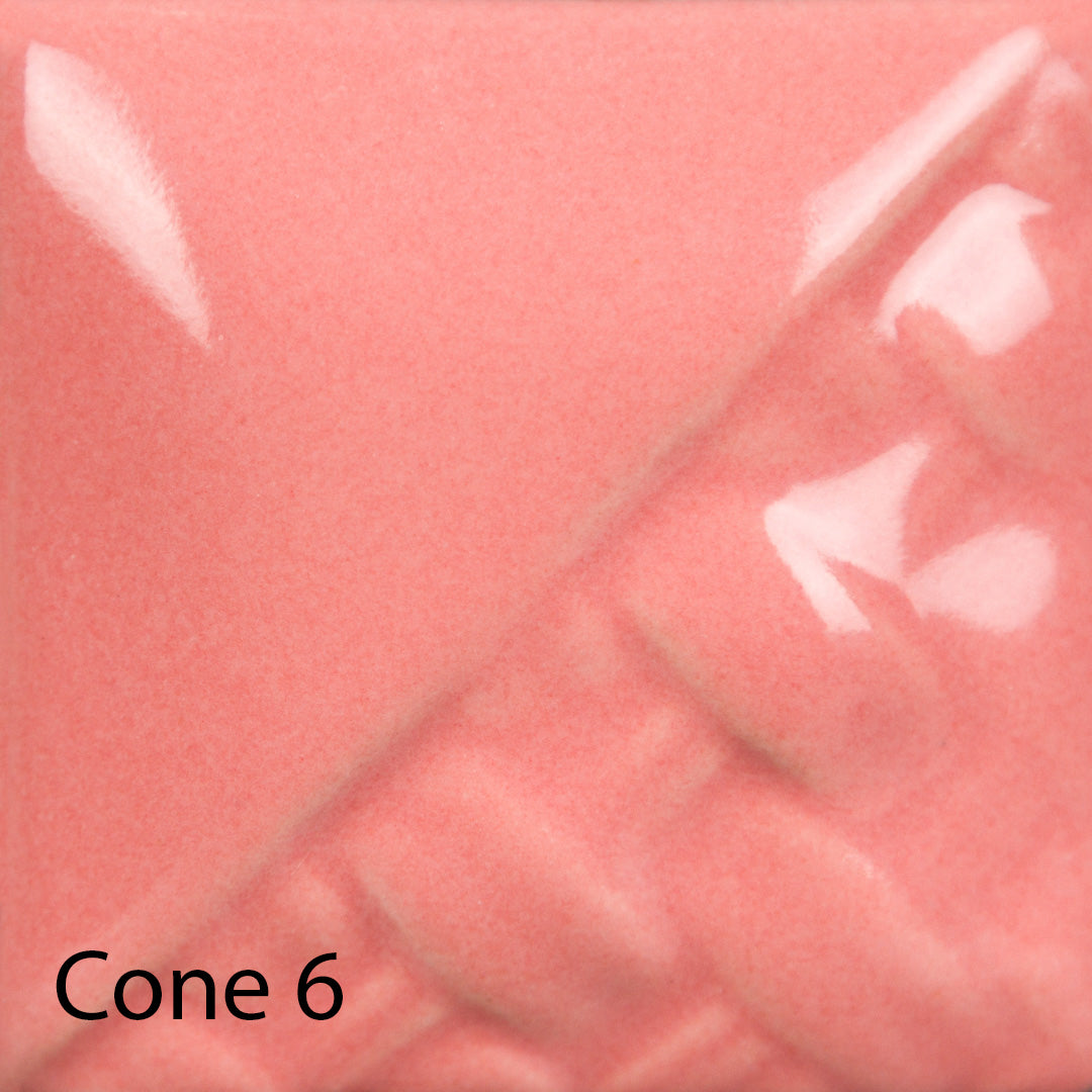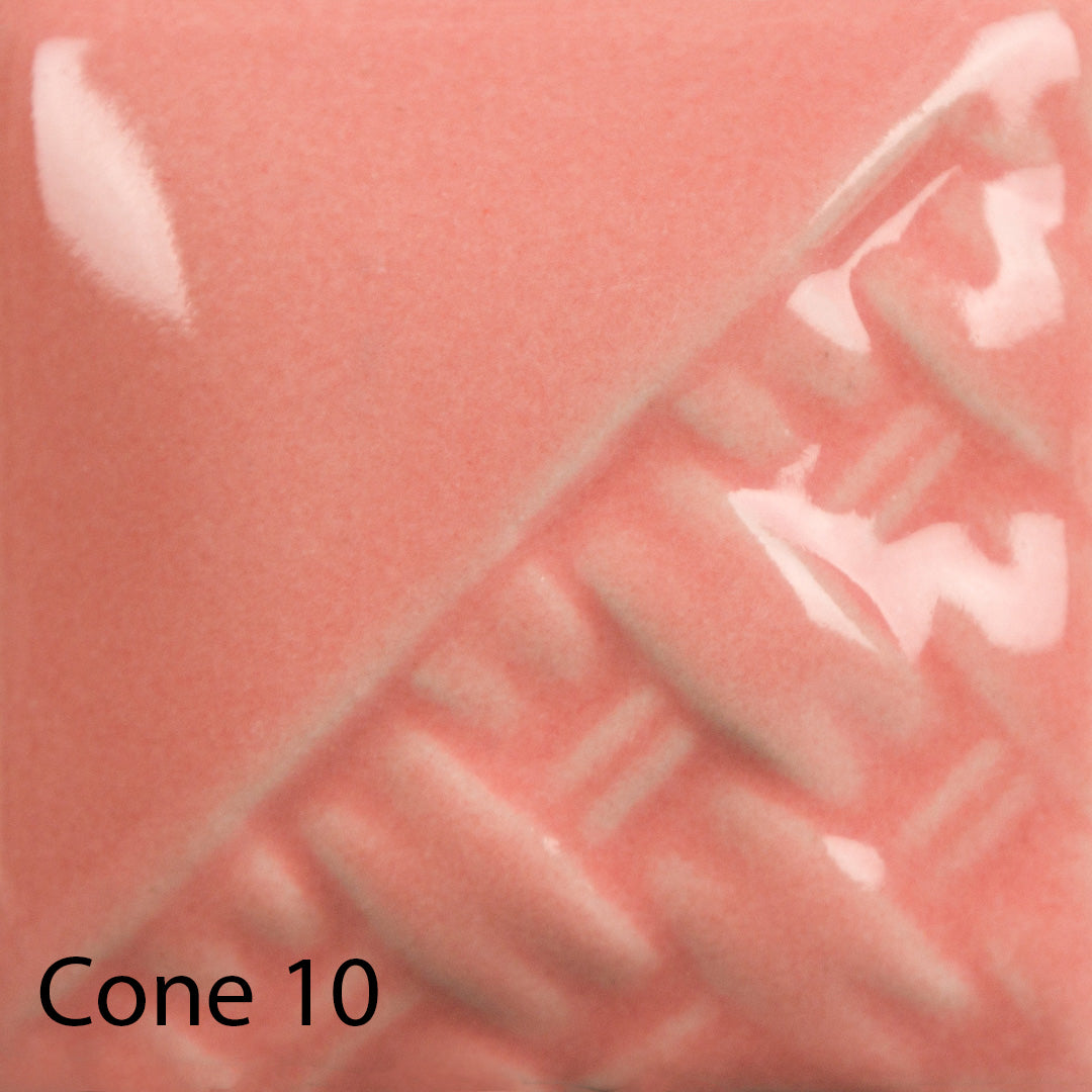 Cone 6 (first image):Pink Gloss is a glossy, opaque, medium pink glaze that is highly pigmented and formulated for stable design work at midrange temperatures and above.