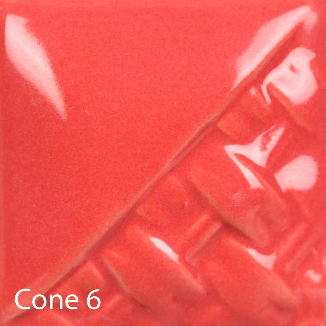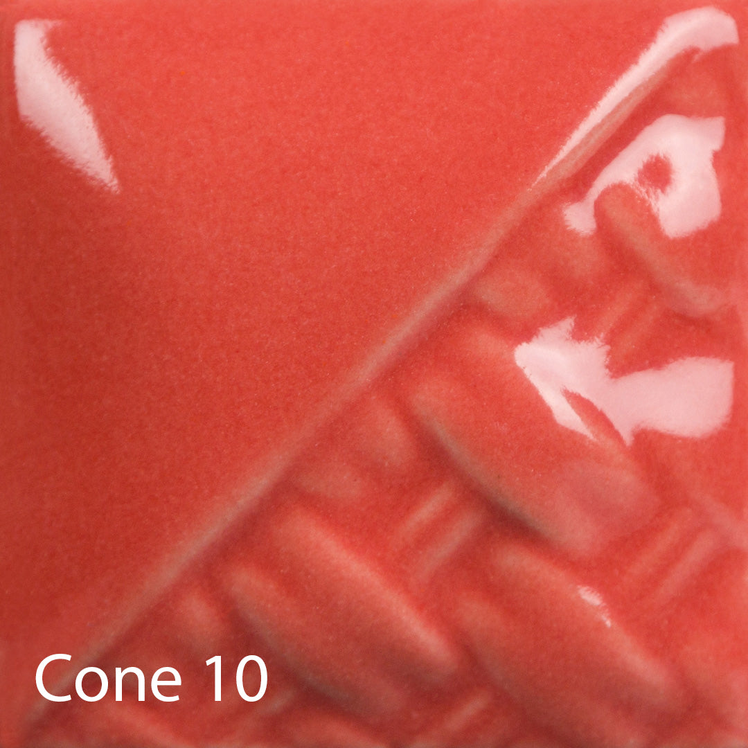 Cone 6 (first image): Coral Gloss is a glossy, opaque, vibrant coral glaze that is highly pigmented and formulated for stable design work at midrange temperatures and above.