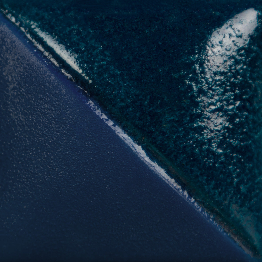 Cone 6 oxidation (second image): Color turns blue. Recommended clear glaze is SW-001 Stoneware Clear.