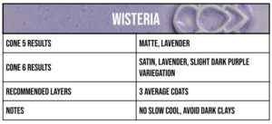 Wisteria is a dreamy even toned lavender with a satin to matte finish. When fired at Cone 5 this glaze gives a full matte finish. Wisteria will assuredly bring a higher level of sophistication to any surface, but is not recommended for dark clay bodies.