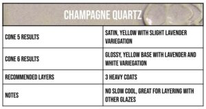 Champagne Quartz is a gloss glaze that toasts to flowing lavender and golden hue alliances. A showcase of movement on its own, Champagne Quartz provides the perfect encore when layered with other Mid-Fire glazes.