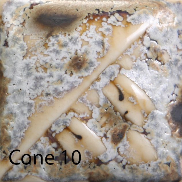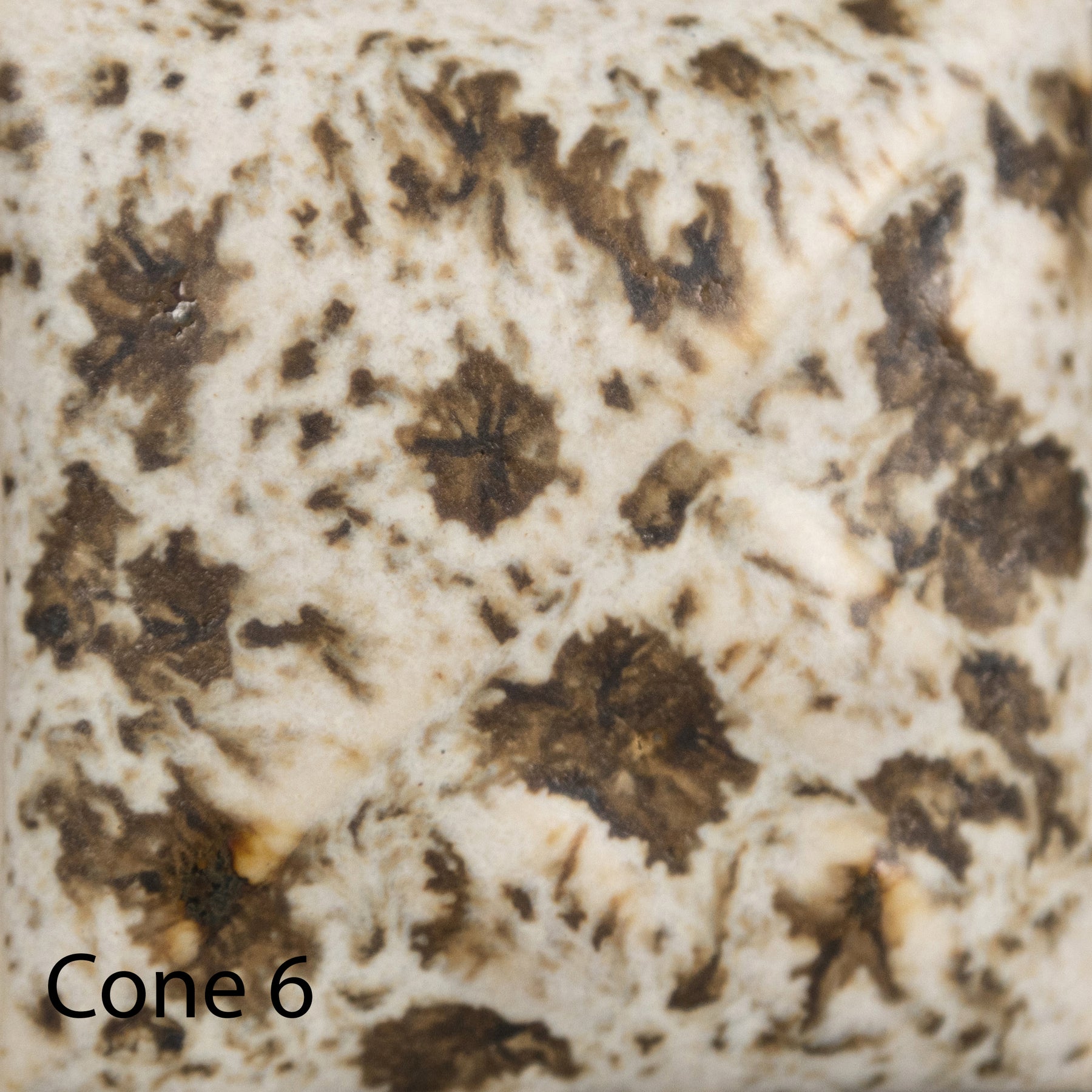 Cone 6: Winter Wood is a matte white glaze that contains a variety of brown crystals that melt.