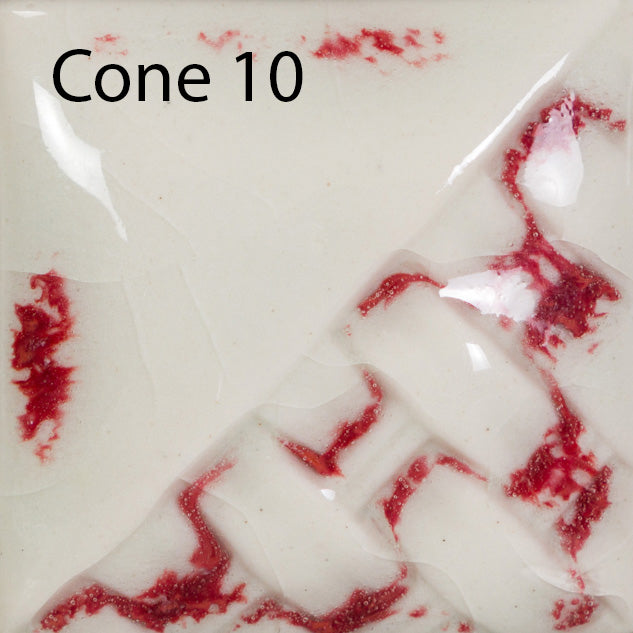 Cone 10: Gloss finish is enhanced and less milky. Red pooling is brighter.