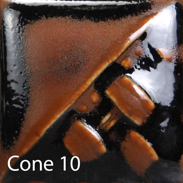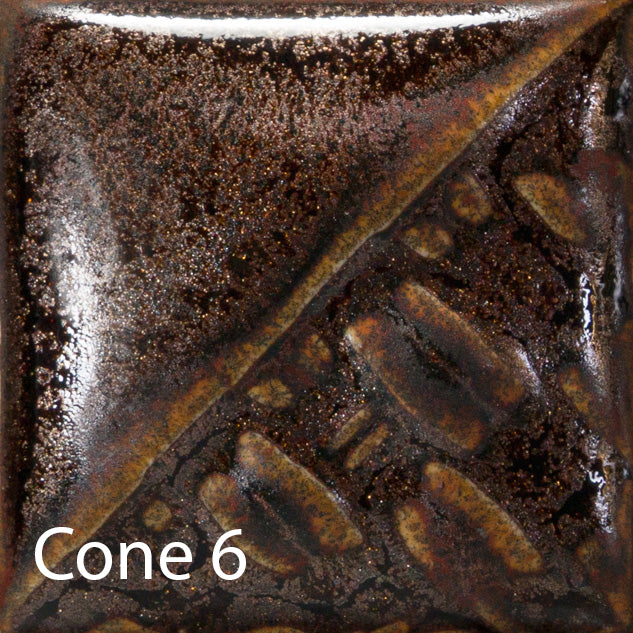 Cone 6: Copper Ore is a highly mobile, reddish brown metallic glaze. A dark bronze field breaks with areas of darker coloring and flashes of brighter red metallic. The movement within this glaze produces striking visual textures.