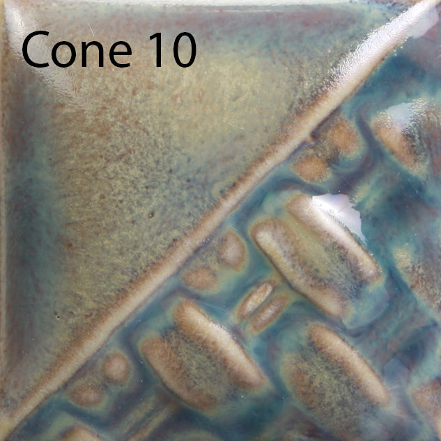Cone 6: Aurora Green produces a mottled aqua gloss glaze with light brown and large black crystals. As the crystals melt, bursts of blue and brown will develop.