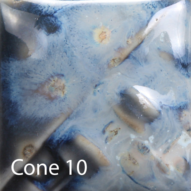 Cone 6: Galaxy is a semi-transparent charcoal colored gloss glaze that contains a three-tone white, orange, and blue crystal. As the crystal melts, a brilliant bloom of white, orange, and blue appears. The glaze is reminiscent of a star being born.