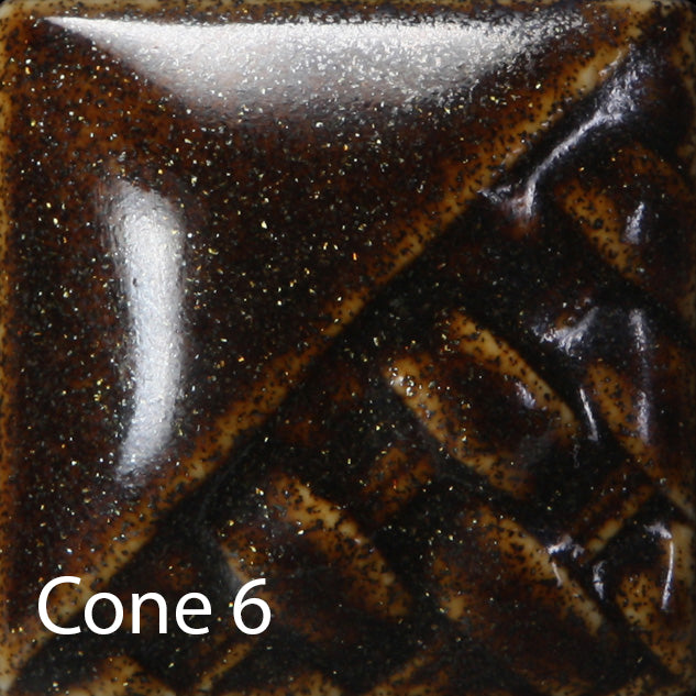 Cone 6: Fool’s Gold is a gloss, semi-transparent glaze consisting of a rich brown base with tiny, gold metallic flecks. The variation of glaze depends on application. The thicker the application, the more homogenous the color will be. The glaze will break translucent and pool darker around surface textures.